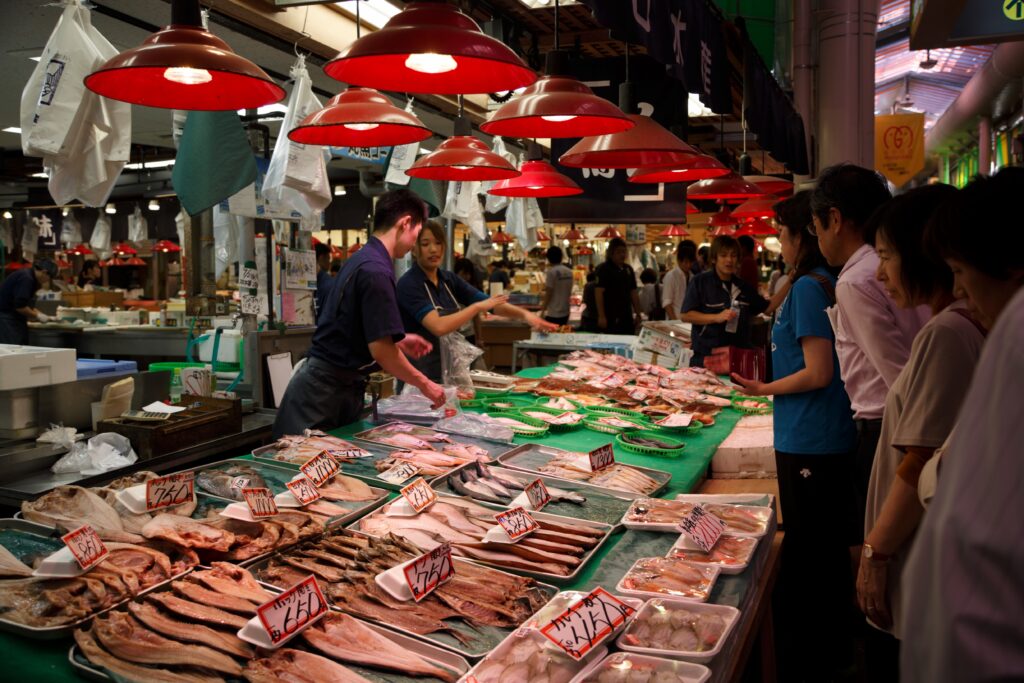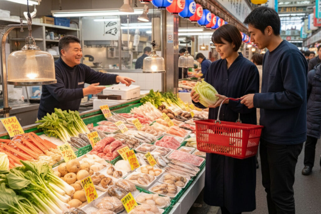 Visitors are welcome to buy. You can simply point to what you want and, if you say you’re planning to use it in hot pot, many stalls will cut and prepare it for you. Cod can be chopped into pieces with the bone in, which gives excellent flavour to the broth. Yellowtail can be sliced thinly so you can briefly dip it in the hot broth, the way locals eat it. Crab can sometimes be partially cracked so it’s easier to pick out the meat at the table. You don’t need to over-buy. For two to three adults, a small selection of seafood plus a few vegetables is already enough for a full evening.